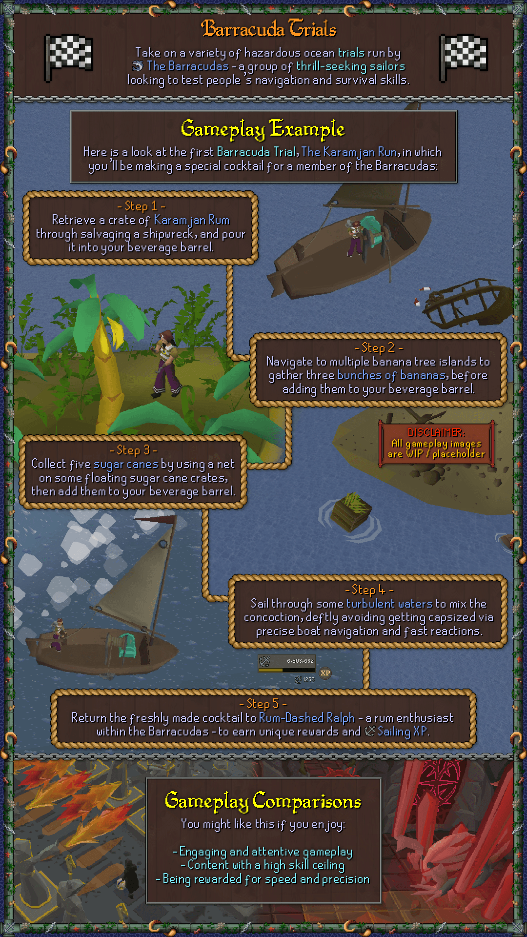 Early-game Sailing will take place in the familiar waters around Port Sarim, Catherby, and Karamja. Your first Barracuda Trial takes place in the tropical waters around Musa Point, where Rum-Dashed Ralph has a cocktail of fun prepared for you.