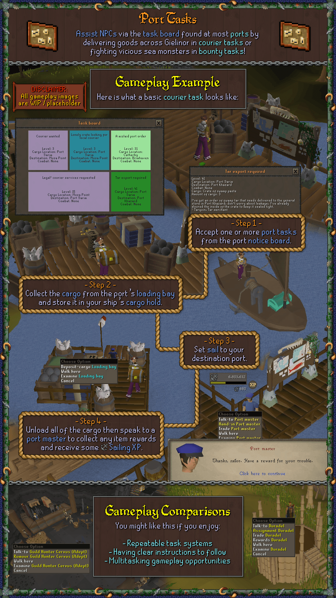 Port Tasks grant Sailing XP upon completion, raising in line with the difficulty of the Task. This is something we’re still balancing, but it will also vary based on the starting port and the type of task you take. We expect this activity to provide a reliable source of GP and XP per hour, and imagine Port Tasks will mostly be completable on the way to other Sailing activities.