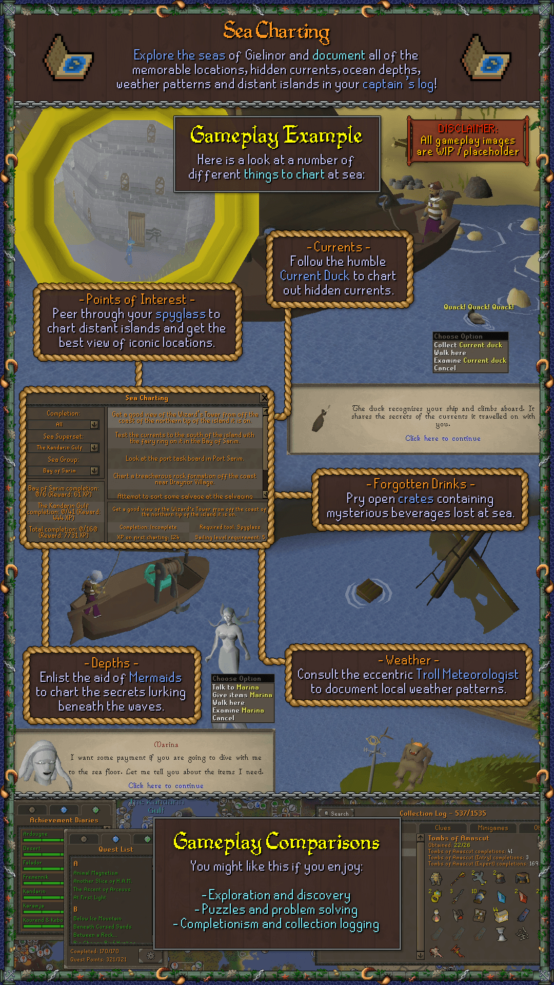 We’ve aimed to capture the feeling we all experienced the very first time we logged into RuneScape, when the short walk from Lumbridge to Varrock felt like an arduous journey, and you never knew what surprises might be waiting just around the bend. Charting the sea turns the thrill of exploration into a bona fide mechanic, rewarding you for exploring new islands and seeking out new experiences.