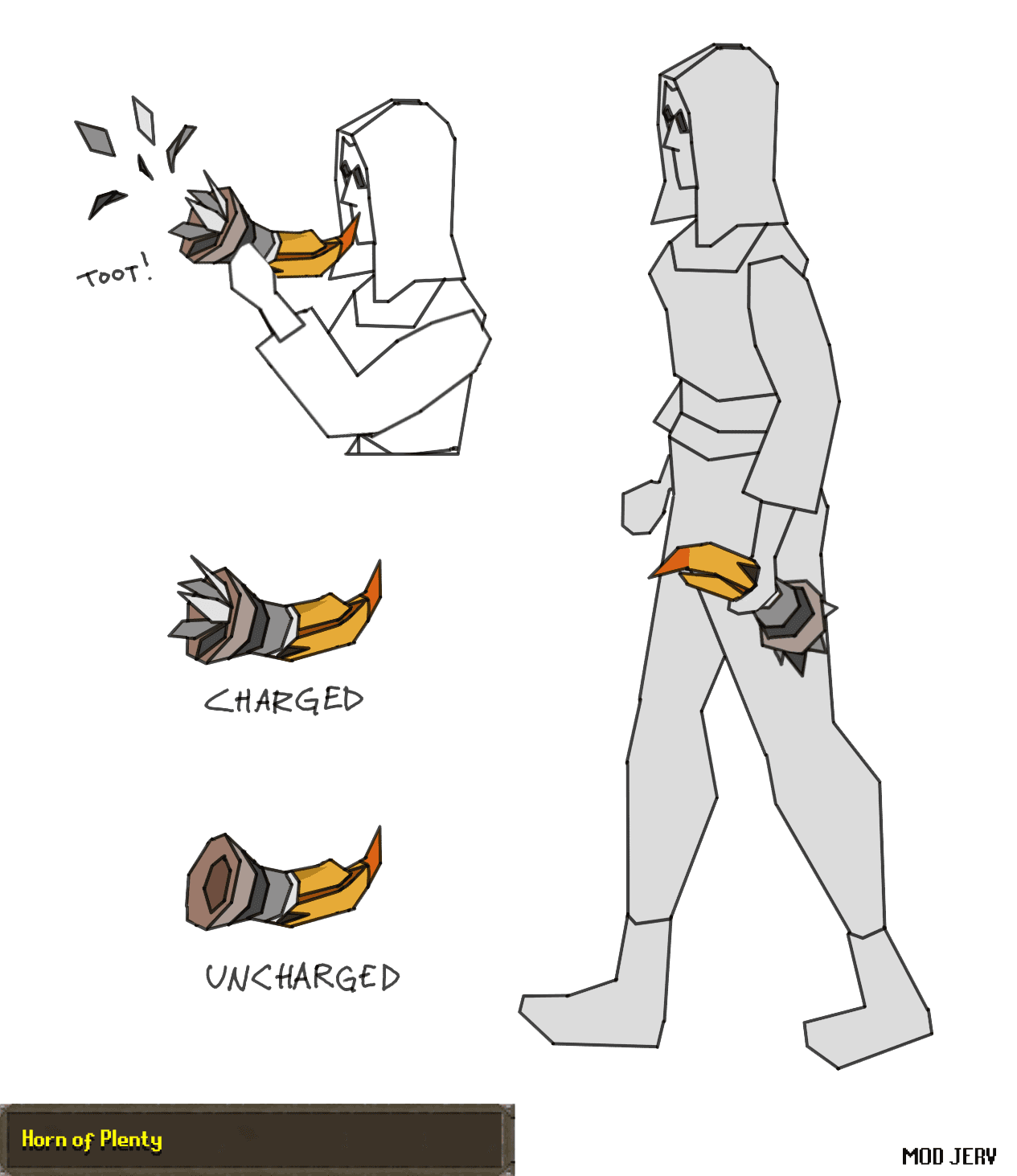 Players have asked that we remove the upkeep cost from the Horn of Plenty. Originally, we proposed that it give a +4 invisible boost to your Hunter level when charged, doing nothing when uncharged. If we simply removed the upkeep cost, that +4 boost would affect all kinds of existing activities - Chinchompas, Molch pearls, Monkey tails, etc. - with no cost. We think that'd be a bit too much! Still, we do understand that upkeep costs can be annoying, so we'd like to propose that it give a +2 invisible buff when uncharged, increasing to +4 when you charge it with the Gryphon feathers.