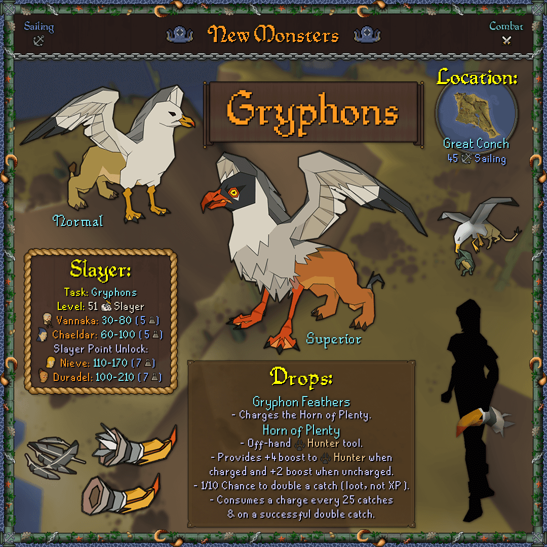 Dev Comment: With the Horn of Plenty, we wanted to explore using the off-hand slot for a meaningful skilling purpose, since it's pretty under-utilised for skilling in particular. Skilling rewards from PvM are also relatively rare, and we felt it was a great opportunity to bridge that gap. Traditionally, PvM has often acted as a way to bypass skilling by pumping large amounts of resources into the game. This time, we want to flip that idea on its head by using a PvM encounter to create an item that directly enhances a skill. By doing so, we hope to make Gryphons feel like a more natural addition to the game. Hunter in particular can sometimes feel like it has long stretches where new levels don't unlock much value. The invisible Hunter boost improves your success rate, making those activities feel a bit more rewarding. Meanwhile, the chance to double your catches provides a nice extra benefit, reinforcing our goal of getting PvM to support skilling content.