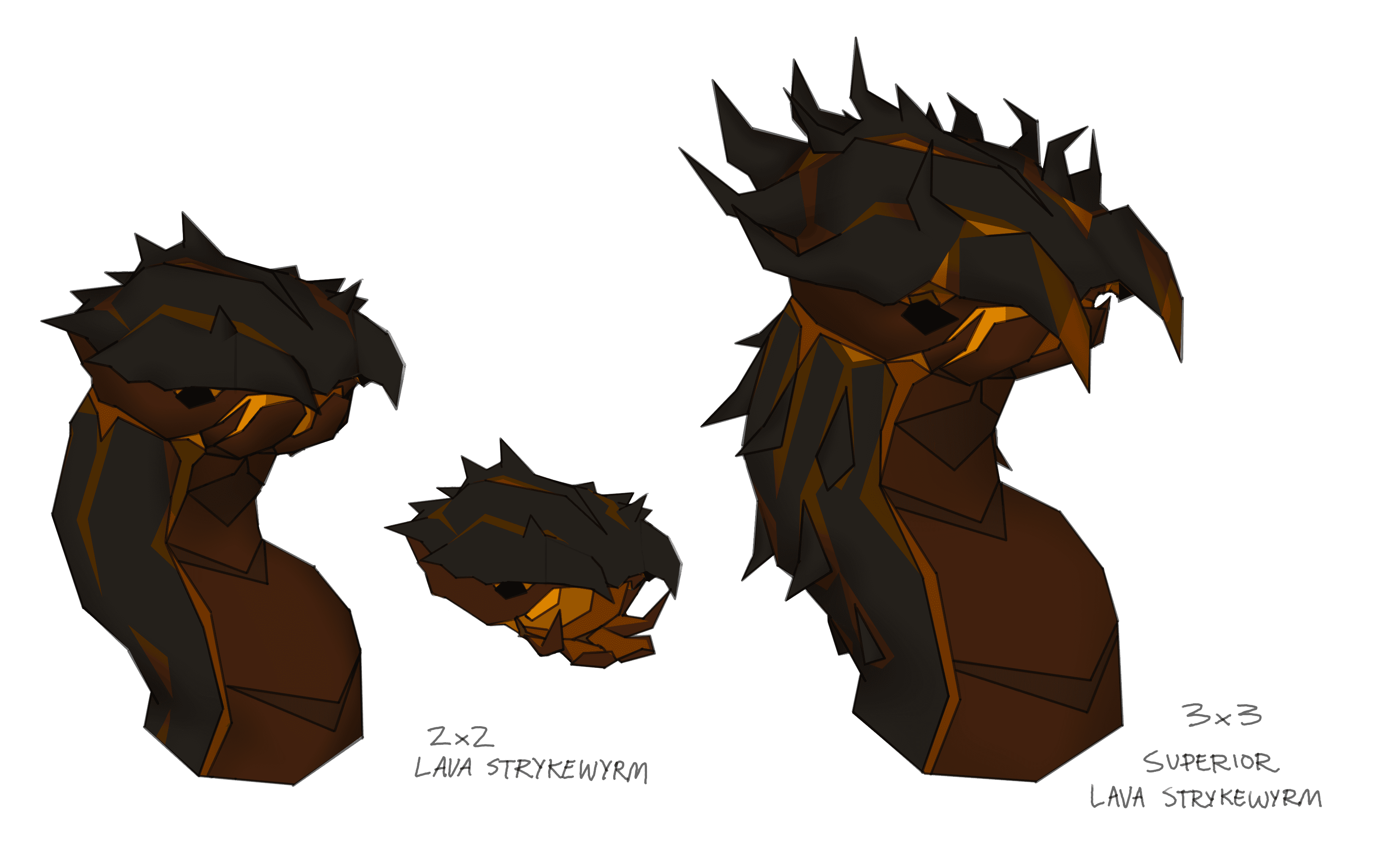 Deep within the scorched heart of Charred Island lurk the Lava strykewyrms. Some claim they were born from violent eruptions long ago, while others suggest they are a less natural creation. The truth has long been lost, but some hints might still be found in the dungeon where they dwell. These monstrous creatures pose a constant danger, with larger ones burrowing beneath the ground, ready to erupt without warning and ambush any adventurer who dares to get too close!