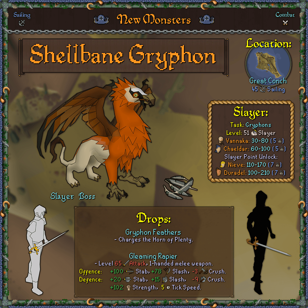 The Shellbane Gryphon is a brand-new, mid-level Slayer boss. It can also only be fought while on a Slayer task. At just 51 Slayer, it will be the lowest-level Slayer boss in the game. We think it can help give players a taste of Slayer bosses and their unique mechanics much earlier than currently available. Just remember, it's a solo-instance fight!