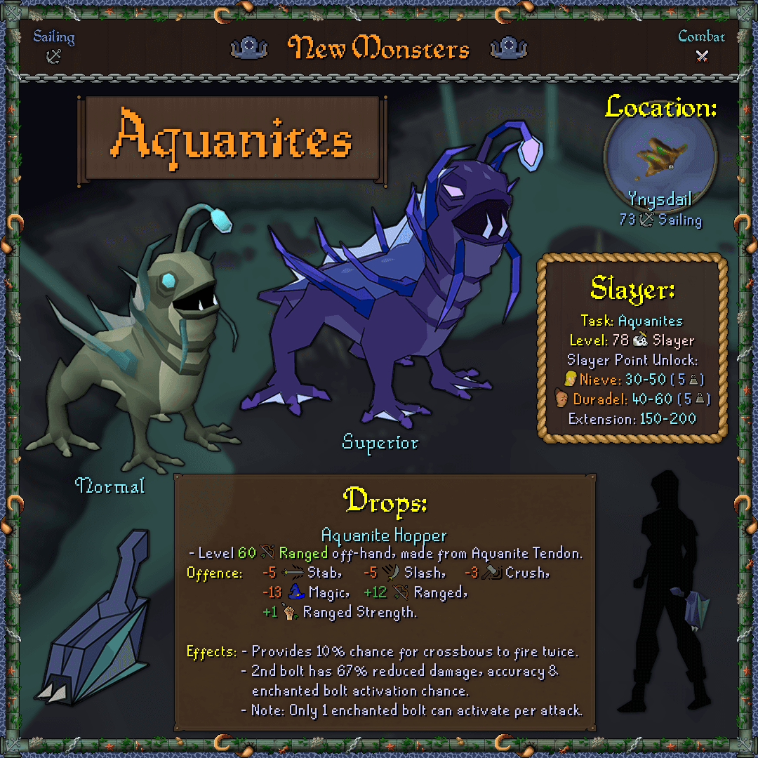 We've seen some community feedback to suggest this feels underpowered compared to the skill levels required to obtain it. To address that, we're lowering the slayer requirement for Aquanites down to level 78. However, we're not looking to increase its power further at present. The goal is for the Hopper to be a strong offhand option while using Crossbows until players get the Twisted Buckler. It's not an end-game item and shouldn't be as strong as one. Unfortunately, that means it probably won't drastically shift up the Ranged meta. We're not looking to make Crossbows more effective than higher tier weapons like the Bow of Faerdhinen, but it should be a reasonable option for mid-game accounts.