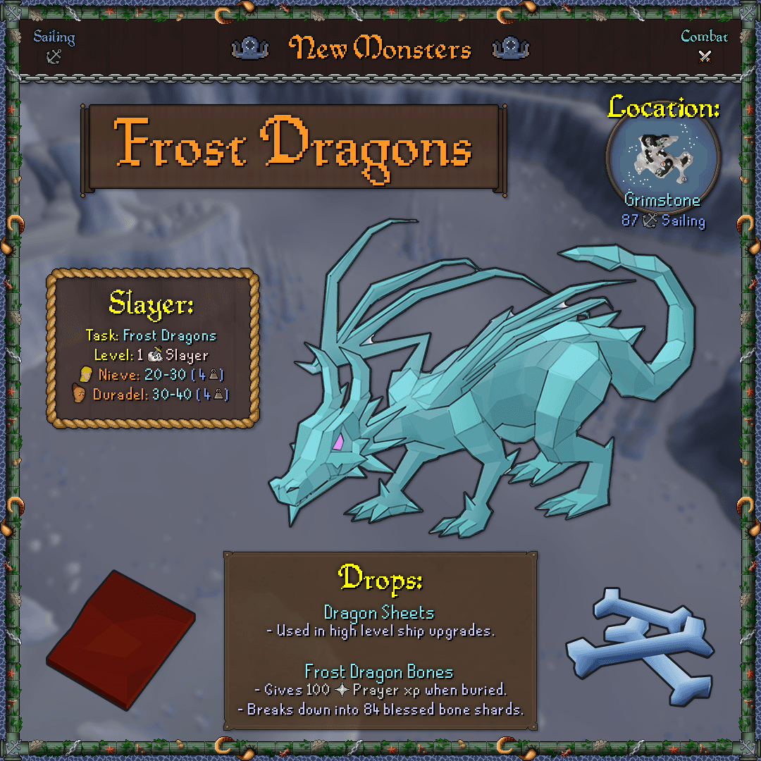 If you are an experienced Sailor, you may chart a course to Grimstone, a long-forgotten frozen island. Few who set foot here will ever return, for deep within its icy heart lie the Frost dragons. These ancient beasts are entombed in permafrost, their chilling breath seeping into the air. If you catch a glimpse of their shimmery scales, heed it as a warning and retreat, unless you're willing to take on a trial colder and deadlier than any other!